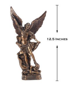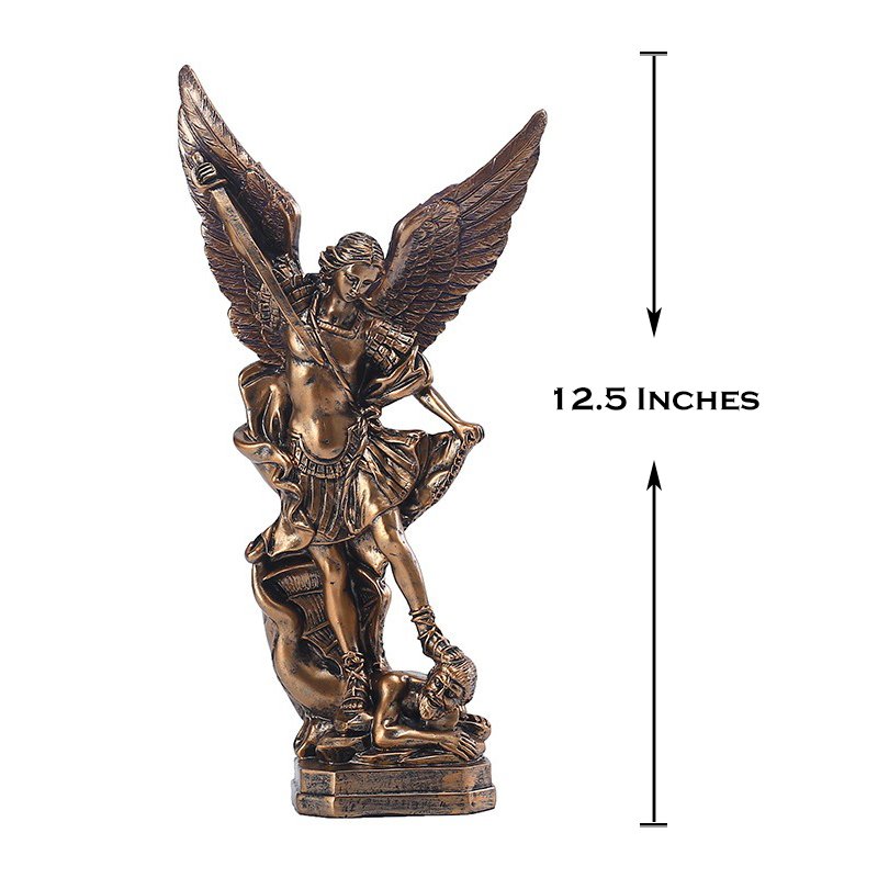 This bronze St Michael statue captures the archangel in a timeless pose as he defeats the demon under his feet. Standing at 12.5 inches tall and cast in durable resin with a bronze metallic finish, the sculpture combines classical style with strong spiritual symbolism. The detailed armor, sweeping wings and dynamic movement make this piece an impressive centerpiece for Christian homes, offices, chapels and devotional spaces.