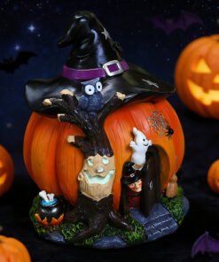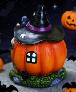 With its vibrant colors, charming characters, and glow-in-the-dark features, this Halloween witch pumpkin house resin decor is the perfect piece to celebrate the spooky season with fun and creativity.